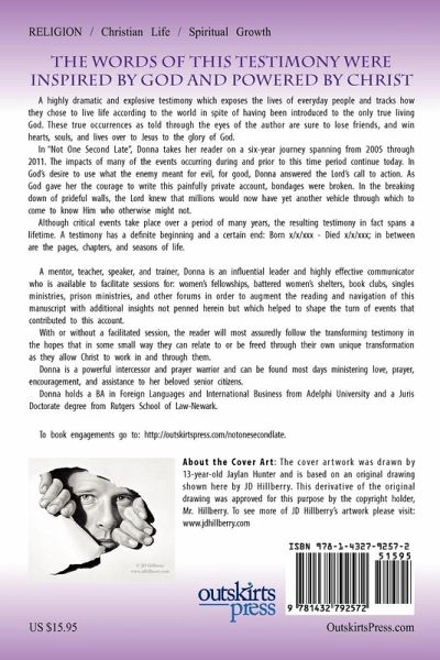 The words of this testimony were inspired by God and powered by Christ. A highly dramatic and explosive testimony which exposes the lives of everyday people and tracks how they chose to live life according to the world in spite of having been introduced to the only true living God. These true occurrences as told through the eyes of the author are sure to lose friends, and win hearts, souls, and lives over to Jesus to the glory of God. In "Not One Second Late", Donna takes her reader on a 6 year journey spanning from 2005 thru 2011. The impacts of many of the events occurring during and prior to this time period continue today. In God's desire to use what the enemy meant for evil, for good, Donna answered the Lord's call to action. As God gave her the courage to write this painfully private account, bondages were broken. In the breaking down of prideful walls, the Lord knew that millions would now have yet another vehicle through which to come to know Him who otherwise might not. Although critical events take place over a period of many years, the resulting testimony in fact spans a lifetime. A testimony has a definite beginning and a certain end: Born x/x/xxx - Died x/x/xxx; in between are the pages, chapters, and seasons of life. A mentor, teacher, speaker, and trainer, Donna is an influential leader and highly effective communicator who is available to facilitate sessions for: women's fellowships, battered women's shelters, book clubs, singles ministries, prison ministries, and other forums in order to augment the reading and navigation of this manuscript with additional insights not penned herein but which helped to shape the turn of events that contributed to this account. With or without a facilitated session, the reader will most assuredly follow the transforming testimony in the hopes that in some small way they can relate to or be freed through their own unique transformation as they allow Christ to work in and thru them. Donna is a powerful intercessor and prayer warrior and can be found most days ministering love, prayer, encouragement, and assistance to her beloved senior citizens. Donna holds a BA in Foreign Languages and International Business from Adelphi University and a Juris Doctorate degree from Rutgers School of Law-Newark. To book engagements go to: https://outskirtspress.com/notonesecondlate. About the Cover Art: The cover artwork was drawn by 13 year old Jaylan Hunter and is based on an original drawing by JD Hillberry. This derivative of the Photo original drawing was approved for this purpose by the copyright holder, goes Mr. Hillberry. To see more of JD Hillberry's artwork please visit www.jdhillberry.com.
