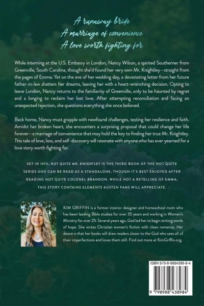 A runaway bride A marriage of convenience A love worth fighting for While interning at the U.S. Embassy in London, Nancy Wilson, a spirited Southerner from Greenville, South Carolina, thought she'd found her very own Mr. Knightley-straight from the pages of Emma. Yet on the eve of her wedding day, a devastating letter from her future father-in-law shatters her dreams, leaving her with a heart-wrenching decision. Opting to leave London, Nancy returns to the familiarity of Greenville, only to be haunted by regret and a longing to reclaim her lost love. After attempting reconciliation and facing an unexpected rejection, she questions everything she once believed. Back home, Nancy must grapple with newfound challenges, testing her resilience and faith. Amidst her broken heart, she encounters a surprising proposal that could change her life forever-a marriage of convenience that may hold the key to finding her true Mr. Knightley. This tale of love, loss, and self-discovery will resonate with anyone who has ever yearned for a love story worth fighting for. Set in 1970, Not Quite Mr. Knightley is the third book of the Not Quite Series and can be read as a standalone, though it's best enjoyed after reading Not Quite Colonel Brandon. While not a retelling of Emma, this story contains elements Austen fans will appreciate. Content Warning: This book contains characters who consider abortion and who have an abortion in their past. Abortion is discussed several times from a Christian perspective, emphasizing forgiveness and healing in Christ. If you have an abortion in your past, please read the resources section at the end of the book and visit DeeperStill.org for free Christ centered retreats.