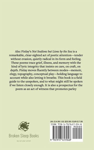 Alec Finlay's Not Sealions but Lions by the Sea is a remarkable, clear-sighted act of poetic attention-tender without evasion, quietly radical in its form and feeling. These poems trace grief, illness, and memory with the kind of lyric integrity that insists on care, on craft, on depth. Finlay moves fluently between modes-memoir, elegy, topography, conceptual play-holding language to account while also letting it breathe. This book is a field guide to the unspoken, and to what might still be spoken if we listen closely enough. It is also a prospectus for the poem as an act of witness that promotes parley.