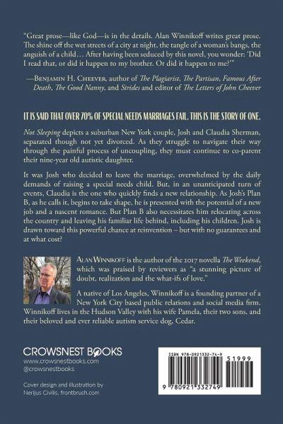 It is said that over 70% of special needs marriages fail. This is the story of one. Not Sleeping depicts a suburban New York couple, Josh and Claudia Sherman, separated though not yet divorced. As they struggle to navigate their way through the painful process of uncoupling, they also must continue to co-manage the difficult demands of their nine-year old autistic daughter. It was Josh who decided to leave the marriage. But, in an unanticipated turn of events, Claudia is the one who quickly finds a new relationship. As the story moves forward, Josh's Plan B, as he calls it, begins to take shape. It is centered around a possible new job and his own nascent romance. But Plan B also necessitates him to moving to California and leaving his familiar life, and specifically his children, behind. Josh is drawn toward this powerful chance at reinvention -- but with no guarantees and at what cost?
