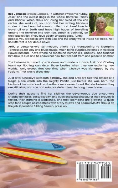Bec Johnson lives in Lubbock, TX with her awesome hubby, Josef and the cutest dogs in the whole Universe, Friday and Charlie. When she's not losing her mind at the call center she works at, you can find her writing hilarious stories in her beautiful sunroom. Bec and Josef love to travel all over Earth and have high hopes of travelling around the Universe one day, too. Zooch is definitely on their bucket list! If you love goofy, unapologetic, funny people, you will fall in love with Bec and the crazy world inside her head. Not So Different is her debut novel. Arëk, a centuries-old Schmecum, thinks he's transporting to Memphis, Tennessee, for BBQ and blues music. Much to his surprise, he lands in Haleiwa, Hawaii instead. That's where he meets his human BFF, Chelsey. She teaches him how to surf and he shows her how to transport from one place to another. The Universe is turned upside down and inside out once Arek and Chelsey team up. Nothing can deter those besties when they are exploring new worlds. Well, except that one time when Chelsey was kidnapped by the Fasians. That was a dicey day! Just after Chelsey's sixteenth birthday, she and Arëk are told the details of a tragic plane crash into the mighty Pacific just before she was born. The bodies of her sister and two brothers were never found. But she believes they are still alive, and she and Arëk are determined to bring them home. During their quest to find her siblings the adventurous duo encounters snobby geniuses, sassy royalty, and even sneezing dinosaurs! Their bravery is tested, their stamina is weakened, and their stomachs are growling! A quick stop for a couple of smoothies with crazy straws and peanut M&M's should do the job. Operation Sibling Search, press on!