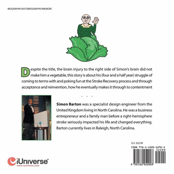 Despite the title, the brain injury to the right side of Simon's brain did not make him a vegetable, this story is about his (four and a half year) struggle of coming to terms with and poking fun at the Stroke Recovery process and through acceptance and reinvention, how he eventually makes it through to contentment