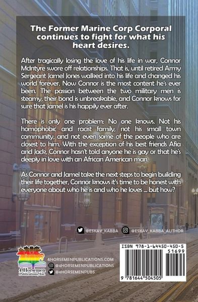 The Former Marine Corp Corporal continues to fight for what his heart desires. After tragically losing the love of his life in war, Connor McIntyre swore off relationships. That is, until retired Army Sergeant Jamel Jones walked into his life and changed his world forever. Now Connor is the most content he's ever been. The passion between the two military men is steamy, their bond is unbreakable, and Connor knows for sure that Jamel is his happily ever after. There is only one problem: No one knows. Not his homophobic and racist family, not his small town community, and not even some of the people who are closest to him. With the exception of his best friends Afia and Jack, Connor hasn't told anyone he is gay or that he's deeply in love with an African American man. As Connor and Jamel take the next steps to begin building their life together, Connor knows it's time to be honest with everyone about who he is and who he loves ... but how?