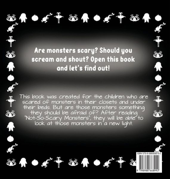 Are monsters scary? Should you scream and shout? Open this book and let's find out! Some children believe there are monsters under their bed or in their closets. It's scary to think that something could be in there with them. "Not-So-Scary Monsters" helps children to see these monsters in a different and silly way. For example, did you know that all your missing socks are because one of the monsters uses them for puppet shows? As well as being a rhyming picture book, there are also questions to help guide parents to talk to their children about what they just read and how they can conquer their fears. It can also be used in the classroom by teachers during SEL or circle time. So what is Not-So-Scary Monsters about?A rhyming picture book Shows monsters in a new light Helps children overcome their fear of monsters Teaches children what to do if they are scared Has discussion questions at the end for parents and/or teachers If you are looking for a fun, silly, and imaginative book that can help children with their fear of monsters, look no further than "Not-So-Scary Monsters". Recommended for ages 2-9...or if you're scared of monsters.