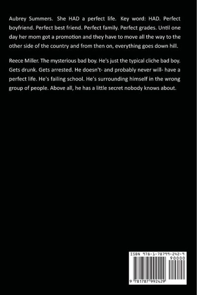 Aubrey Summers. She HAD a perfect life. Key word: HAD. Perfect boyfriend. Perfect best friend. Perfect family. Perfect grades. Until one day her mom got a promotion and they have to move all the way to the other side of the country and from then on, everything goes down hill. Reece Miller. The mysterious bad boy. He's just the typical cliche bad boy. Gets drunk. Gets arrested. He doesn't- and probably never will- have a perfect life. He's failing school. He's surrounding himself in the wrong group of people. Above all, he has a little secret nobody knows about.