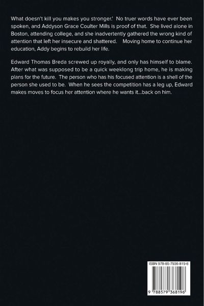 What doesn't kill you makes you stronger.' No truer words have ever been spoken, and Addyson Grace Coulter Mills is proof of that. She lived alone in Boston, attending college, and she inadvertently gathered the wrong kind of attention that left her insecure and shattered. Moving home to continue her education, Addy begins to rebuild her life. Edward Thomas Breda screwed up royally, and only has himself to blame. After what was supposed to be a quick weeklong trip home, he is making plans for the future. The person who has his focused attention is a shell of the person she used to be. When he sees the competition has a leg up, Edward makes moves to focus her attention where he wants it...back on him.