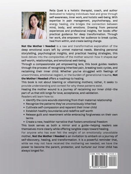 Not the Mother I Needed: A Journey to Healing Intergenerational Wounds is a deeply personal and transformative exploration of what it means to grow up without the nurturing, validation, or emotional support we needed from our mothers. For many, the absence of this foundational love creates wounds that linger well into adulthood, shaping our sense of self-worth, our relationships, and our ability to trust and connect with others. This book offers a path toward understanding, healing, and ultimately breaking the cycle of generational pain. Through a blend of personal storytelling, psychological insights, and actionable healing strategies, Not the Mother I Needed dives into the complexities of the mother wound-how it forms, how it manifests in our daily lives, and how it silently influences our beliefs about love, safety, and belonging. This book is for anyone who has ever felt unseen, unheard, or unworthy due to the emotional absence or dysfunction of their mother. Whether you experienced neglect, manipulation, criticism, or emotional enmeshment, the impact of these wounds can be profound. But they do not have to define you. This book is not about blaming or villainizing mothers; rather, it seeks to provide understanding and context for why these patterns exist. Many of our mothers were carrying their own unresolved pain, often passing down what they themselves endured. Recognizing this can be a painful yet liberating step-allowing us to hold space for compassion while also setting boundaries and choosing a different path for ourselves. Healing the mother wound is a journey of reclaiming our inner child-the part of us that still longs for love, acceptance, and validation. Not the Mother I Needed offers practical tools to navigate this process, including guided reflections, journaling prompts, and somatic healing exercises. Readers will learn how to: * Identify the core wounds stemming from their maternal relationship * Recognize the patterns they've unconsciously inherited * Cultivate self-compassion and reparent their inner child * Establish healthy boundaries and redefine self-worth * Release guilt and resentment while embracing forgiveness on their own terms * Create a new, healthier narrative that fosters emotional freedom This book serves as both a mirror and a guide-helping readers see themselves more clearly while offering tangible steps toward healing. It encourages deep self-reflection but also provides hope, reminding us that we are not doomed to repeat the past. By choosing to heal, we disrupt generational cycles and create space for a future built on self-love and conscious relationships. For anyone who has ever felt the weight of an emotionally absent mother, Not the Mother I Needed is an invitation to embark on a journey of self-discovery, healing, and transformation. It is a powerful reminder that, while we may not have received the mothering we needed, we have the power to become the parent, protector, and nurturer our inner child has always longed for.