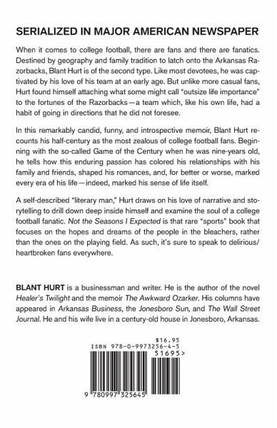 When it comes to college football, there are fans and there are fanatics. Destined by geography and family tradition to latch onto the Arkansas Razorbacks, Blant Hurt is of the second type. Like most devotees, he was captivated by his love of his team at an early age. But unlike more casual fans, Hurt found himself attaching what some might call "outsize life importance" to the fortunes of the Razorbacks -a team which, like his own life, had a habit of going in directions that he did not foresee. In this remarkably candid, funny, and introspective memoir, Blant Hurt recounts his half-century as the most zealous of college football fans. Beginning with the so-called Game of the Century when he was nine-years old, he tells how this enduring passion has colored his relationships with his family and friends, shaped his romances, and, for better or worse, marked every era of his life-indeed, marked his sense of life itself. A self-described "literary man," Hurt draws on his love of narrative and storytelling to drill down deep inside himself and examine the soul of a college football fanatic. Not the Seasons I Expected is that rare "sports" book that focuses on the hopes and dreams of the people in the bleachers, rather than the ones on the playing field. As such, it's sure to speak to delirious/heartbroken fans everywhere.