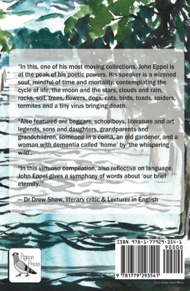 In this, one of his most moving collections John Eppel is at the peak of his poetic powers. His speaker is a wizened soul, mindful of time and mortality, contemplating the cycle of life, the moon and the stars, clouds and rain, rocks, soil, tree, flowers, dogs, cats, birds, toads, spiders, termites and a tiny virus bringing us death. Also featured are beggars, schoolboys, literature and art legends, sons and daughters, grandparents and grandchildren. John Eppel gives a symphony of words about 'our brief eternity.
