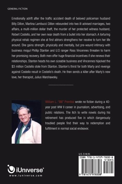Emotionally adrift after the traffic accident death of beloved policeman husband Billy Dillon, Martina Lambucci Dillon rebounded into two ill-advised marriages, two affairs, a multi-million dollar theft, the murder of her protected witness husband, Robert Costello, and her own near death from a bullet into her stomach. A torturing physical rehab regimen she at first abhors strengthens her resolve to turn her life around. She gains strength, physically and mentally, but pre-wound intimacy with business mogul Phillip Stanton and U.S ranger Ross Vincennes threaten to harm her promising recovery. Both men offer huge financial incentives if she renews their relationships. Stanton heads his own sizeable business and Vincennes hijacked the $3 million Costello stole from Stanton. Stanton's thirst for both Marty and revenge against Costello result in Costello's death. He then sends a killer after Marty's new love, her therapist, Julius Warshawsky.