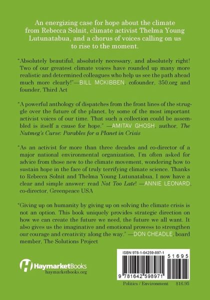 An energizing case for hope about the climate, from Rebecca Solnit ("the voice of the resistance"-New York Times), climate activist Thelma Young Lutunatabua, and a chorus of voices calling on us to rise to the moment. Not Too Late is the book for anyone who is despondent, defeatist, or unsure about climate change and seeking answers. As the contributors to this volume make clear, the future will be decided by whether we act in the present-and we must act to counter institutional inertia, fossil fuel interests, and political obduracy. These dispatches from the climate movement around the world feature the voices of organizers like Guam-based lawyer and writer Julian Aguon; climate scientists like Dr. Jacquelyn Gill and Dr. Edward Carr; poets like Marshall Islands activist Kathy Jetnil-Kijner; and longtime organizers like The Tyranny of Oil author Antonia Juhasz. Guided by Rebecca Solnit's typical clear-eyed wisdom and enriched by photographs and quotes, Not Too Late leads readers from discouragement to possibilities, from climate despair to climate hope.