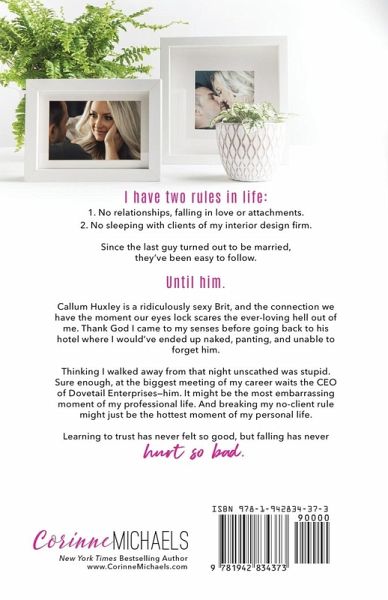 From New York Times Bestseller, Corinne Michaels, comes a sexy new standalone romance novel. I have two rules in life: 1. No relationships, falling in love or attachments. 2. No sleeping with clients of my interior design firm. Since the last guy turned out to be married, they’ve been easy to follow. Until him. Callum Huxley is a ridiculously sexy Brit, and the connection we have the moment our eyes lock scares the ever-loving hell out of me. Thank God I came to my senses before going back to his hotel where I would’ve ended up naked, panting, and unable to forget him. Thinking I walked away from that night unscathed was stupid. Sure enough, at the biggest meeting of my career waits the CEO of Dovetail Enterprises—him. It might be the most embarrassing moment of my professional life. And breaking my no-client rule might just be the hottest moment of my personal life. Learning to trust has never felt so good, but falling has never hurt so bad.