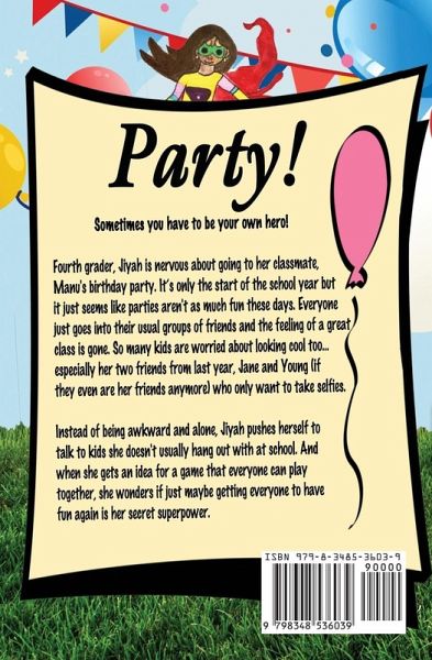 Sometimes you have to be your own hero! Fourth grader, Jiyah is nervous to go to her classmate, Manu's birthday party. It's only the start of the school year but it just seems like parties aren't as much fun these days. Everyone just goes into their usual groups of friends and the feeling of a great class is gone. So many kids are too worried about looking cool too ... especially her two friends from last year, Jane and Young (if they even are her friends anymore) who only want to take selfies. Instead of being awkward and alone Jiyah pushes herself to talk to kids she doesn't usually hang out with at school. And when she gets an idea for a game that everyone can play together, she wonders if just maybe getting everyone to have fun again is her secret superpower. This was written without the help of Artificial Intelligence.