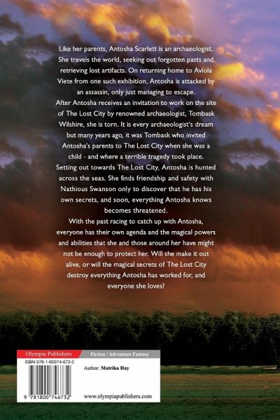 Like her parents, Antosha Scarlett is an archaeologist. She travels the world, seeking out forgotten pasts and retrieving lost artifacts. On returning home to Avíola Viete from one such exhibition, Antosha is attacked by an assassin, only just managing to escape. After Antosha receives an invitation to work on the site of The Lost City by renowned archaeologist, Tombask Wilshire, she is torn. It is every archaeologist's dream but many years ago, it was Tombask who invited Antosha's parents to The Lost City when she was a child - and where a terrible tragedy took place. Setting out towards The Lost City, Antosha is hunted across the seas. She finds friendship and safety with Nathious Swanson only to discover that he has his own secrets, and soon, everything Antosha knows becomes threatened. With the past racing to catch up with Antosha, everyone has their own agenda and the magical powers and abilities that she and those around her have might not be enough to protect her. Will she make it out alive, or will the magical secrets of The Lost City destroy everything Antosha has worked for, and everyone she loves?