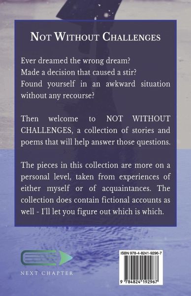 Ever dreamed the wrong dream? Made a decision that caused a stir? Found yourself in an awkward situation without any recourse? Then welcome to NOT WITHOUT CHALLENGES, a collection of stories and poems that will help answer those questions. The pieces in this collection are more on a personal level, taken from experiences of either myself or of acquaintances. The collection does contain fictional accounts as well - I'll let you figure out which is which.