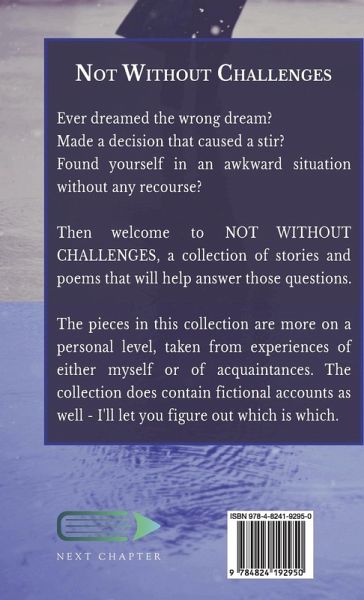 Ever dreamed the wrong dream? Made a decision that caused a stir? Found yourself in an awkward situation without any recourse? Then welcome to NOT WITHOUT CHALLENGES, a collection of stories and poems that will help answer those questions. The pieces in this collection are more on a personal level, taken from experiences of either myself or of acquaintances. The collection does contain fictional accounts as well - I'll let you figure out which is which.