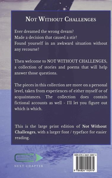 Ever dreamed the wrong dream? Made a decision that caused a stir? Found yourself in an awkward situation without any recourse? Then welcome to NOT WITHOUT CHALLENGES, a collection of stories and poems that will help answer those questions. The pieces in this collection are more on a personal level, taken from experiences of either myself or of acquaintances. The collection does contain fictional accounts as well - I'll let you figure out which is which. This is the large print edition of Not Without Challenges, with a larger font / typeface for easier reading.