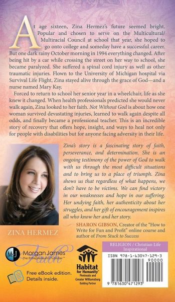 Zina Hermez was just sixteen years old when she suffered a spinal-cord-injury after being hit by a car while crossing the street on her way to school. When health professionals predicted she would never walk again, she looked to God and her faith. "Not Without God: A Story of Survival" is about how one woman survived a devastating injury, learned to walk again despite all odds, and finally became a professional teacher. In a world where people with disabilities can start to feel invisible, she overcame her challenges. This book offers hope, insight, and ways to heal not just for people with disabilities, but for anyone facing adversity in their life.