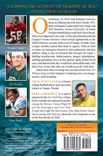 Not Without Hope is the true story of the headline-making tragedy that took the lives of three football players: NFL stars Marquis Cooper and Corey Smith, and Will Bleakley from the University of South Florida. Told by the sole survivor of the ill-fated fishing trip, Nick Schuyler, with New York Times bestselling author and sports journalist Jere Longford, Not Without Hope is an inspiring and unforgettable story of courage and strength, friendship and loss, and, most importantly, hope, in the vein of Touching the Void, Into Thin Air, Between a Rock and a Hard Place, and Piers Paul Read’s classic survival tale, Alive.