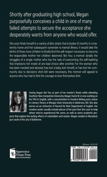 Shortly after graduating high school, Megan purposefully conceives a child in one of many failed attempts to secure the acceptance she desperately wants from anyone who would offer. She soon finds herself in a variety of dire straits that includes 12 months in a maternity home and her subsequent surrender to mental illness. It would take the births of three more children to finally find the self-respect necessary to become the responsible mother her children deserved. Not You: a memoir details the struggles of a single mother who has the task of overcoming the self-loathing that imprisons her inside of one bad choice after another. For the woman who has been mocked and abused, has lost a baby, lost herself, or has lost her community due to decisions she's felt were necessary, this memoir will appeal to anyone who has had to find the courage to love themselves first.