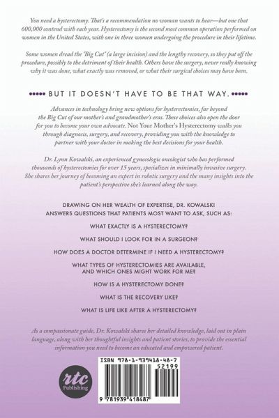 You need a hysterectomy. That's a recommendation no woman wants to hear-but one that 600,000 contend with each year. Hysterectomy is the second most common operation performed on women in the United States, with one in three women undergoing the procedure in their lifetime. Some women dread the "Big Cut" (a large incision) and the lengthy recovery, so they put off the procedure, possibly to the detriment of their health. Others have the surgery, never really knowing why it was done, what exactly was removed, or what their surgical choices may have been. BUT IT DOESN'T HAVE TO BE THAT WAY. Advances in technology bring new options for hysterectomies, far beyond the Big Cut of our mother's and grandmother's eras. These choices also open the door for you to become your own advocate. Not Your Mother's Hysterectomy walks you through diagnosis, surgery, and recovery, providing you with the knowledge to partner with your doctor in making the best decisions for your health. Dr. Lynn Kowalski, an experienced gynecologic oncologist who has performed thousands of hysterectomies for over 15 years, specializes in minimally invasive surgery. She shares her journey of becoming an expert in robotic surgery and the many insights into the patient's perspective she's learned along the way. Drawing on her wealth of expertise, Dr. Kowalski answers questions that patients most want to ask, such as: What exactly is a hysterectomy? What should I look for in a surgeon? How does a doctor determine if I need a hysterectomy? What types of hysterectomies are available, and which ones might work for me? How is a hysterectomy done? What is the recovery like? What is life like after a hysterectomy? As a compassionate guide, Dr. Kowalski shares her detailed knowledge, laid out in plain language, along with her thoughtful insights and patient stories, to provide the essential information you need to become an educated and empowered patient.