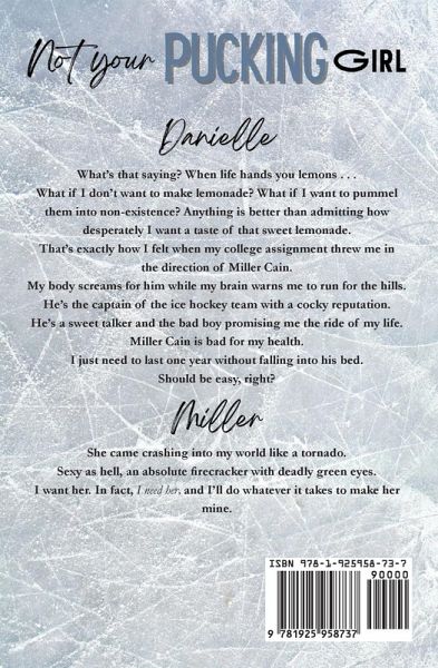 DANIELLE What's that saying? When life hands you lemons . . . What if I don't want to make lemonade? What if I want to pummel them into non-existence? Anything is better than admitting how desperately I want a taste of that sweet lemonade. That's exactly how I felt when my college assignment threw me in the direction of Miller Cain. My body screams for him while my brain warns me to run for the hills. He's the captain of the ice hockey team with a cocky reputation. He's a sweet talker and the bad boy promising me the ride of my life. Miller Cain is bad for my health. I just need to last one year without falling into his bed. Should be easy, right? MILLER She came crashing into my world like a tornado. Sexy as hell, an absolute firecracker with deadly green eyes. I want her. In fact, I need her, and I'll do whatever it takes to make her mine. Not Your Pucking Girl is a New Adult, College Sports Romance with a HEA. CONTENT WARNING: Detailed sexual content, sexual assault, heavy coarse language, fire, and death.