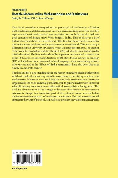 This book fulfils a long-standing gap in the history of modern Indian mathematics, which will make the book very useful to researchers in the history of science and mathematics. Written in very lucid English with little mathematical or statistical jargon makes the book immensely readable even to general readers with interest in scientific history even from non-mathematical, non-statistical background. This book is a clear portrayal of the struggle and success of researchers in mathematical sciences in Bengal (an important part of the colonial India), unveils before the international community of mathematical scientists. The real connoisseurs will appreciate the value of the book, as it will clear up many prevailing misconceptions.