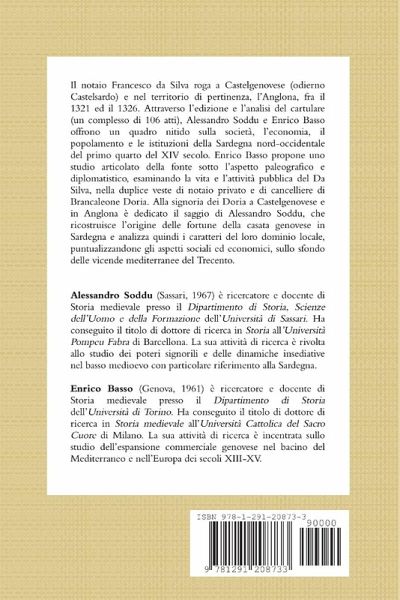 Aonia edizioni. Il notaio Francesco da Silva roga a Castelgenovese (odierno Castelsardo) e nel territorio di pertinenza, l'Anglona, fra il 1321 ed il 1326. Attraverso l'edizione e l'analisi del cartulare (un complesso di 106 atti), Alessandro Soddu e Enrico Basso offrono un quadro nitido sulla società, l'economia, il popolamento e le istituzioni della Sardegna nord-occidentale del primo quarto del XIV secolo. Enrico Basso propone uno studio articolato della fonte sotto l'aspetto paleografico e diplomatistico, esaminando la vita e l'attività pubblica del Da Silva, nella duplice veste di notaio privato e di cancelliere di Brancaleone Doria. Alla signoria dei Doria a Castelgenovese e in Anglona è dedicato il saggio di Alessandro Soddu, che ricostruisce l'origine delle fortune della casata genovese in Sardegna e analizza quindi i caratteri del loro dominio locale, puntualizzandone gli aspetti sociali ed economici, sullo sfondo delle vicende mediterranee del Trecento.