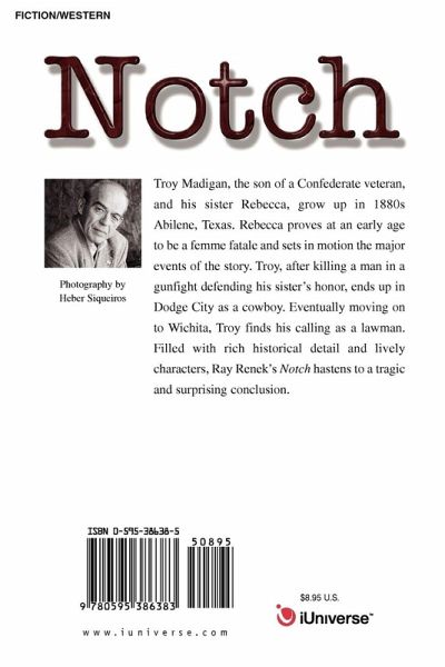 Troy Madigan, the son of a Confederate veteran, and his sister Rebecca, grow up in 1880s Abilene, Texas. Rebecca proves at an early age to be a femme fatale and sets in motion the major events of the story. Troy, after killing a man in a gunfight defending his sister's honor, ends up in Dodge City as a cowboy. Eventually moving on to Wichita, Troy finds his calling as a lawman. Filled with rich historical detail and lively characters, Ray Renek's Notch hastens to a tragic and surprising conclusion.