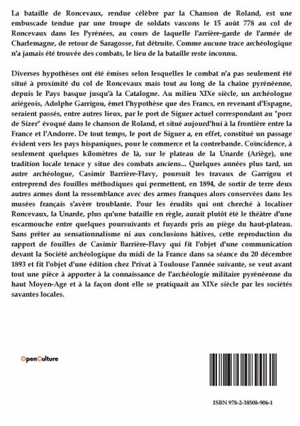 La bataille de Roncevaux, rendue célèbre par la Chanson de Roland, est une embuscade tendue par une troupe de soldats vascons le 15 août 778 au col de Roncevaux dans les Pyrénées, au cours de laquelle l'arrière-garde de l'armée de Charlemagne, de retour de Saragosse, fut détruite. Comme aucune trace archéologique n'a jamais été trouvée des combats, le lieu de la bataille reste inconnu. Diverses hypothèses ont été émises selon lesquelles le combat n'a pas seulement été situé à proximité du col de Roncevaux mais tout au long de la chaîne pyrénéenne, depuis le Pays basque jusqu'à la Catalogne. Au milieu XIXe siècle, un archéologue ariégeois, Adolphe Garrigou, émet l'hypothèse que des Francs, en revenant d'Espagne, seraient passés, entre autres lieux, par le port de Siguer actuel correspondant au "porz de Sizer" évoqué dans le chanson de Roland, et situé aujourd'hui à la frontière entre la France et l'Andorre. De tout temps, le port de Siguer a, en effet, constitué un passage évident vers les pays hispaniques, pour le commerce et la contrebande. Coïncidence, à seulement quelques kilomètres de là, sur le plateau de la Unarde (Ariège), une tradition locale tenace y situe des combats anciens... Quelques années plus tard, un autre archéologue, Casimir Barrière-Flavy, poursuit les travaux de Garrigou et entreprend des fouilles méthodiques qui permettent, en 1894, de sortir de terre deux autres armes dont la ressemblance avec des armes franques alors conservées dans les musées français s'avère troublante. Pour les érudits qui ont cherché à localiser Roncevaux, la Unarde, plus qu'une bataille en règle, aurait plutôt été le théâtre d'une escarmouche entre quelques poursuivants et fuyards pris au piège du haut-plateau. Sans prêter au sensationnalisme ni aux conclusions hâtives, cette reproduction du rapport de fouilles de Casimir Barrière-Flavy qui fit l'objet d'une communication devant la Société archéologique du midi de la France dans sa séance du 20 décembre 1893 et fit l'objet d'une édition chez Privat à Toulouse l'année suivante, se veut avant tout une pièce à apporter à la connaissance de l'archéologie militaire pyrénéenne du haut Moyen-Age et à la façon dont elle se pratiquait au XIXe siècle par les sociétés savantes locales.