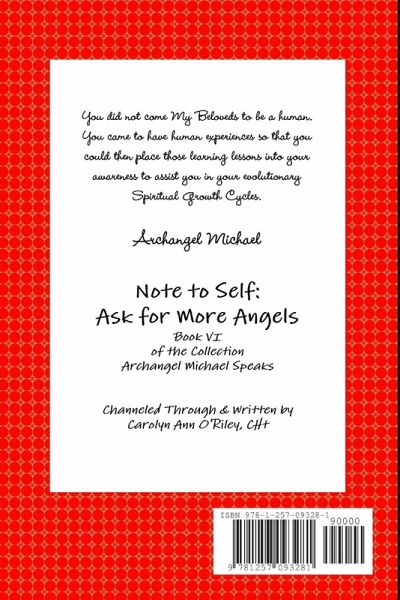 Awaken the sleeping remembrance of your Higher Self. For those on their Spiritual Path this is a must read. Note to Self: Ask For More Angels Book VI of the Collection Archangel Michael Speaks contains wonderful Channeled Messages, Inner Self Exploring Exercises, Prayers for Abundance and Poems to help you remember who you really are. The glorious Channeled Messages are for all of Humanity from Archangel Michael. These Channeled Messages of The Creator's love are very powerful and assist you in learning to go back within yourself through meditation to remember your true Source. Carolyn has been channeling these messages for over 12 years and this is Book VI of the Collection Archangel Michael Speaks. Carolyn is also sharing some of her own intimate life details to help you understand her journey as well. Give yourself permission for Personal Growth and illuminate your Body Mind Spirit Connections with Archangel Michael's divine wisdom.