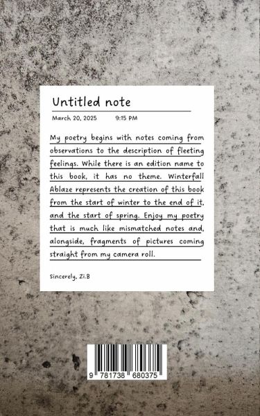 My poetry begins with notes coming from observations to the description of fleeting feelings. While there is an edition name to this book, it has no theme. Winterfall Ablaze represents the creation of this book from the start of winter to the end of it, and the start of spring. Enjoy my poetry that is much like mismatched notes and, alongside, fragments of pictures coming straight from my camera roll. Sincerely, Zi.B