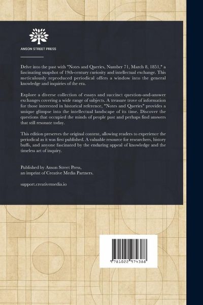Delve into the past with "Notes and Queries, Number 71, March 8, 1851," a fascinating snapshot of 19th-century curiosity and intellectual exchange. This meticulously reproduced periodical offers a window into the general knowledge and inquiries of the era. Explore a diverse collection of essays and succinct question-and-answer exchanges covering a wide range of subjects. A treasure trove of information for those interested in historical reference, "Notes and Queries" provides a unique glimpse into the intellectual landscape of its time. Discover the questions that occupied the minds of people past and perhaps find answers that still resonate today. This edition preserves the original content, allowing readers to experience the periodical as it was first published. A valuable resource for researchers, history buffs, and anyone fascinated by the enduring appeal of knowledge and the timeless art of inquiry. This work has been selected by scholars as being culturally important, and is part of the knowledge base of civilization as we know it. This work is in the public domain in the United States of America, and possibly other nations. Within the United States, you may freely copy and distribute this work, as no entity (individual or corporate) has a copyright on the body of the work. Scholars believe, and we concur, that this work is important enough to be preserved, reproduced, and made generally available to the public. We appreciate your support of the preservation process, and thank you for being an important part of keeping this knowledge alive and relevant.