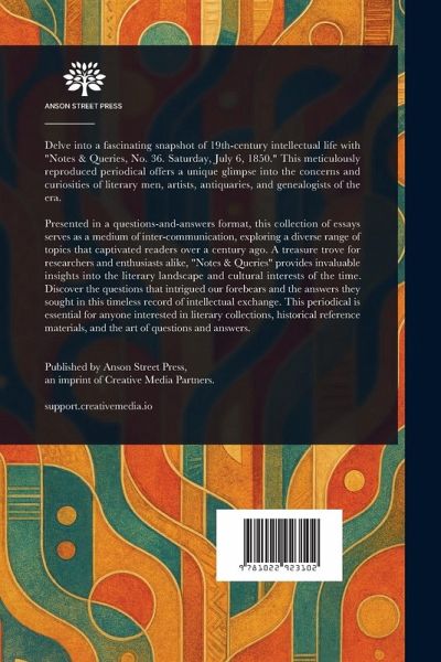 Delve into a fascinating snapshot of 19th-century intellectual life with "Notes & Queries, No. 36. Saturday, July 6, 1850." This meticulously reproduced periodical offers a unique glimpse into the concerns and curiosities of literary men, artists, antiquaries, and genealogists of the era. Presented in a questions-and-answers format, this collection of essays serves as a medium of inter-communication, exploring a diverse range of topics that captivated readers over a century ago. A treasure trove for researchers and enthusiasts alike, "Notes & Queries" provides invaluable insights into the literary landscape and cultural interests of the time. Discover the questions that intrigued our forebears and the answers they sought in this timeless record of intellectual exchange. This periodical is essential for anyone interested in literary collections, historical reference materials, and the art of questions and answers. This work has been selected by scholars as being culturally important, and is part of the knowledge base of civilization as we know it. This work is in the public domain in the United States of America, and possibly other nations. Within the United States, you may freely copy and distribute this work, as no entity (individual or corporate) has a copyright on the body of the work. Scholars believe, and we concur, that this work is important enough to be preserved, reproduced, and made generally available to the public. We appreciate your support of the preservation process, and thank you for being an important part of keeping this knowledge alive and relevant.