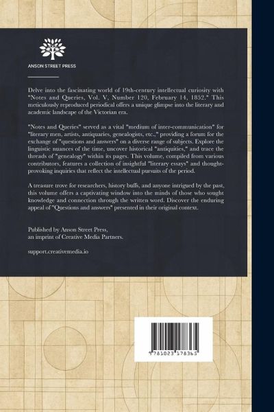 Delve into the fascinating world of 19th-century intellectual curiosity with "Notes and Queries, Vol. V, Number 120, February 14, 1852." This meticulously reproduced periodical offers a unique glimpse into the literary and academic landscape of the Victorian era. "Notes and Queries" served as a vital "medium of inter-communication" for "literary men, artists, antiquaries, genealogists, etc.," providing a forum for the exchange of "questions and answers" on a diverse range of subjects. Explore the linguistic nuances of the time, uncover historical "antiquities," and trace the threads of "genealogy" within its pages. This volume, compiled from various contributors, features a collection of insightful "literary essays" and thought-provoking inquiries that reflect the intellectual pursuits of the period. A treasure trove for researchers, history buffs, and anyone intrigued by the past, this volume offers a captivating window into the minds of those who sought knowledge and connection through the written word. Discover the enduring appeal of "Questions and answers" presented in their original context. This work has been selected by scholars as being culturally important, and is part of the knowledge base of civilization as we know it. This work is in the public domain in the United States of America, and possibly other nations. Within the United States, you may freely copy and distribute this work, as no entity (individual or corporate) has a copyright on the body of the work. Scholars believe, and we concur, that this work is important enough to be preserved, reproduced, and made generally available to the public. We appreciate your support of the preservation process, and thank you for being an important part of keeping this knowledge alive and relevant.