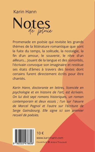 Promenade en poésie à travers une quarantaine de poèmes reprenant les grands thèmes de la littérature romantique chers à l'auteure, que sont la fuite du temps, la solitude, la nostalgie, la fin d'un amour, le souvenir, le rêve d'un ailleurs. Jouant de la langue et des sonorités, l'écrivain convoque son imaginaire et restitue ses états d'âmes à travers des textes dont certains furent directement écrits pour être chantés.