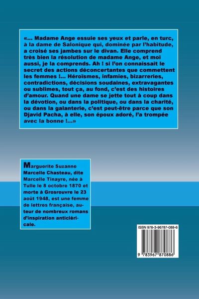 «... Madame Ange essuie ses yeux et parle, en turc, à la dame de Salonique qui, dominée par l'habitude, a croisé ses jambes sur le divan. Elle comprend très bien la résolution de madame Ange, et moi aussi, je la comprends. Ah ! si l'on connaissait le secret des actions déconcertantes que commettent les femmes !… Héroïsmes, infamies, bizarreries, contradictions, décisions soudaines, extravagantes ou sublimes, tout ça, au fond, c'est des histoires d'amour. Quand une dame se jette tout à coup dans la dévotion, ou dans la politique, ou dans la charité, ou dans la galanterie, c'est peut-être parce que son Djavid Pacha, à elle, son époux adoré, l'a trompée avec la bonne !...»