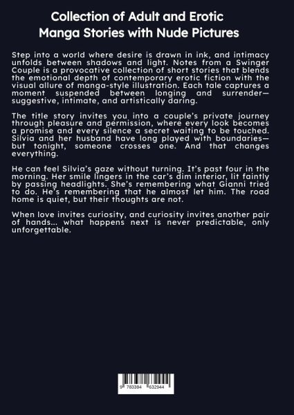 Step into a world where desire is drawn in ink, and intimacy unfolds between shadows and light. Notes from a Swinger Couple is a provocative collection of short stories that blends the emotional depth of contemporary erotic fiction with the visual allure of manga-style illustration. Each tale captures a moment suspended between longing and surrender-suggestive, intimate, and artistically daring.The title story invites you into a couple's private journey through pleasure and permission, where every look becomes a promise and every silence a secret waiting to be touched. Silvia and her husband have long played with boundaries-but tonight, someone crosses one. And that changes everything.He can feel Silvia's gaze without turning. It's past four in the morning. Her smile lingers in the car's dim interior, lit faintly by passing headlights. She's remembering what Gianni tried to do. He's remembering that he almost let him. The road home is quiet, but their thoughts are not.When love invites curiosity, and curiosity invites another pair of hands... what happens next is never predictable, only unforgettable.