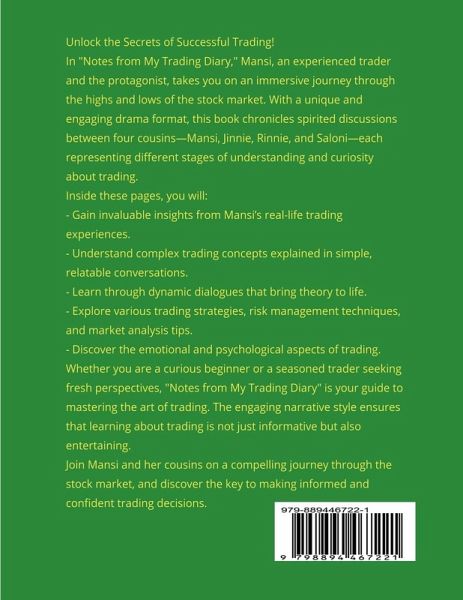 Unlock the Secrets of Successful Trading! In "Notes from My Trading Diary," Mansi, an experienced trader and the protagonist takes you on an immersive journey through the highs and lows of the stock market. With a unique and engaging drama format, this book chronicles spirited discussions between four cousins-Mansi, Jinnie, Rinnie, and Saloni-each representing different stages of understanding and curiosity about trading. Inside these pages, you will: - Gain invaluable insights from Mansi's real-life trading experiences. - Understand complex trading concepts explained in simple, relatable conversations. - Learn through dynamic dialogues that bring theory to life. - Explore various trading strategies, risk management techniques, and market analysis tips. - Discover the emotional and psychological aspects of trading. Whether you are a curious beginner or a seasoned trader seeking fresh perspectives, "Notes from My Trading Diary" is your guide to mastering the art of trading. The engaging narrative style ensures that learning about trading is not just informative but also entertaining. Join Mansi and her cousins on a compelling journey through the stock market, and discover the key to making informed and confident trading decisions.