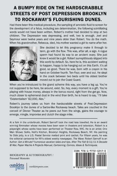 Had there been this medical procedure, the sampling of amniotic fluid to screen for the development of a fetus, including sex determination, the following scintillating words would not have been written. Robert's mother had decided to stop at two children. The Depression was depressing, and well, two is enough. Joel and Seymour were twelve years and nine years older than Robert. You do the math. When his grandmother, Rebecca, died, his mother wanted a girl to name after her. She decided to let this pregnancy make it through to term, go with the flow. This was, after all, a sign. A rogue sperm had found its way to an ancient ovary. She just knew it would be a girl. Robert surreptitiously slipped into this world by default. So, here he is, this accident waiting to happen, happy to be hanging out on this Earth. It's all good, so good. There he was, born with a crayon in his hand on October fourth. Ten-Four, over and out. He slept in the crack between two beds until his oldest brother moved out to join the Coast Guard. When you're introduced to the grand scheme this way, you have a leg up. You're not supposed to be here, be around, exist. So, hey, every moment is a gift. You're playing with house money, always in the bonus round, right from the get-go. Now, much closer to ephemeral dust in the wind than birth, he is heard to say, "I'll take 'Existentialism' $2,000, Alex." Robert's journey takes us from the hardscrabble streets of Post-Depression Brooklyn to the dunes of a Sartre-like Rockaway beach. Tales are couched in the conceit of Dinner Theater as he peers out from the wings, gains the courage to emerge, mingle, improvise and clutch the stage mike.