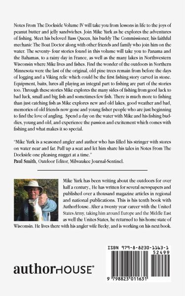 Notes From The Dockside Volume IV will take you from lessons in life to the joys of peanut butter and jelly sandwiches. Join Mike Yurk as he explores the adventures of fishing. Meet his beloved Bass Queen, his buddy The Commissioner, his faithful mechanic The Boat Doctor along with other friends and family who join him on the water. The seventy- four stories found in this volume will take you to Panama and the Bahamas, to a rainy day in France, as well as the many lakes in Northwestern Wisconsin where Mike lives and fishes. Find the wonder of the outdoors in Northern Minnesota were the last of the original, old pine trees remain from before the days of logging and a Viking relic which could be the first fishing story carved in stone. Equipment, baits, lures all playing an integral part to fishing are part of the stories too. Through these stories Mike explores the many sides of fishing from good luck to bad luck, small and big fish and sometimes few fish. There is much more to fishing than just catching fish as Mike explores new and old lakes, good weather and bad, memories of old friends now gone and young fisher people who are just beginning to find the love of angling. Spend a day on the water with Mike and his fishing buddies, young and old, and experience the passion and excitement which comes with fishing and what makes it so special. "Mike Yurk is a seasoned angler and author who has filled his stringer with stores on water near and far. Pull up a seat and let him share his tales in Notes From The Dockside one pleasing nugget at a time." Paul Smith, Outdoor Editor, Milwaukee Journal-Sentinel.