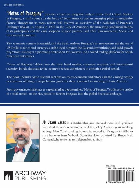 "Notes of Paraguay" provides a brief yet insightful analysis of the local Capital Markets in Paraguay, a small country in the heart of South America and an emerging player in sustainable finance. Throughout its pages, readers will discover an overview of the evolution of Paraguay's Exchange (Bolsa), its origins in 1992 in the City of Asunción, the increasing professionalization of its participants, and the early adoption of good practices and ESG (Environmental, Social, and Governance) standards. The economic context is essential, and the book explores Paraguay's bi-monetarism and the use of US Dollar as functional currency, a stable local currency the Guarani, low inflation, and solid growth projections, making it a promising destination for investors and a sound trading platform for South American enterprises. "Notes of Paraguay" delves into the local bond market, corporate securities and international sovereign bonds, showcasing the country's recent experiences in attracting global capital. The book includes some relevant sections on macroeconomic indicators and the existing savings mechanisms, offering a comprehensive guide for those interested in investing in Latin America. From governance challenges to capital market opportunities, "Notes of Paraguay" outlines the profile of a small nation on the rise, poised to further integrate into the global financial landscape.
