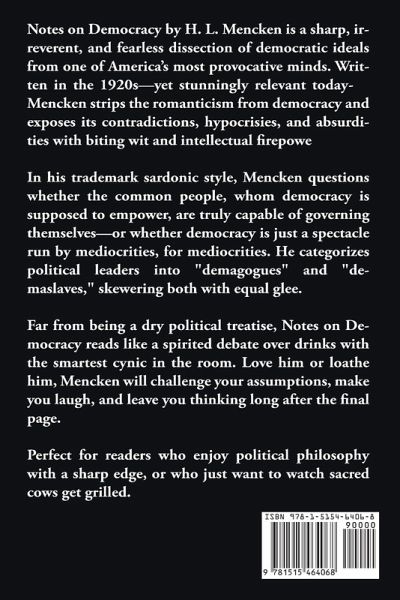 Notes on Democracy by H. L. Mencken is a sharp, irreverent, and fearless dissection of democratic ideals from one of America's most provocative minds. Written in the 1920s-yet stunningly relevant today-Mencken strips the romanticism from democracy and exposes its contradictions, hypocrisies, and absurdities with biting wit and intellectual firepower. In his trademark sardonic style, Mencken questions whether the common people, whom democracy is supposed to empower, are truly capable of governing themselves-or whether democracy is just a spectacle run by mediocrities, for mediocrities. He categorizes political leaders into "demagogues" and "demaslaves," skewering both with equal glee. Far from being a dry political treatise, Notes on Democracy reads like a spirited debate over drinks with the smartest cynic in the room. Love him or loathe him, Mencken will challenge your assumptions, make you laugh, and leave you thinking long after the final page. Perfect for readers who enjoy political philosophy with a sharp edge, or who just want to watch sacred cows get grilled.