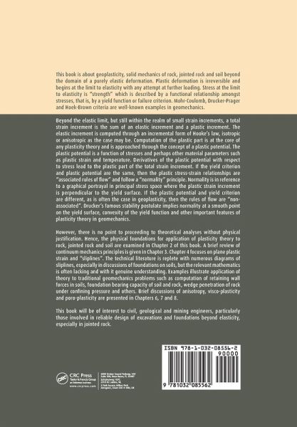 This book is about geoplasticity, solid mechanics of rock, jointed rock and soil beyond the domain of a purely elastic deformation. Plastic deformation is irreversible and begins at the limit to elasticity with any attempt at further loading. Stress at the limit to elasticity is "strength" which is described by a functional relationship amongst stresses, that is, by a yield function or failure criterion. Mohr-Coulomb, Drucker-Prager and Hoek-Brown criteria are well-known examples in geomechanics. Beyond the elastic limit, but still within the realm of small strain increments, a total strain increment is the sum of an elastic increment and a plastic increment. The elastic increment is computed through an incremental form of Hooke's law, isotropic or anisotropic as the case may be. Computation of the plastic part is at the core of any plasticity theory and is approached through the concept of a plastic potential. The plastic potential is a function of stresses and perhaps other material parameters such as plastic strain and temperature. Derivatives of the plastic potential with respect to stress lead to the plastic part of the total strain increment. If the yield criterion and plastic potential are the same, then the plastic stress-strain relationships are "associated rules of flow" and follow a "normality" principle. Normality is in reference to a graphical portrayal in principal stress space where the plastic strain increment is perpendicular to the yield surface. If the plastic potential and yield criterion are different, as is often the case in geoplasticity, then the rules of flow are "non-associated". Drucker's famous stability postulate implies normality at a smooth point on the yield surface, convexity of the yield function and other important features of plasticity theory in geomechanics. However, there is no point to proceeding to theoretical analyses without physical justification. Hence, the physical foundations for application of plasticity theory to rock, jointed rock and soil are examined in Chapter 2 of this book. A brief review of continuum mechanics principles is given in Chapter 3. Chapter 4 focuses on plane plastic strain and "sliplines". The technical literature is replete with numerous diagrams of sliplines, especially in discussions of foundations on soils, but the relevant mathematics is often lacking and with it genuine understanding. Examples illustrate application of theory to traditional geomechanics problems such as computation of retaining wall forces in soils, foundation bearing capacity of soil and rock, wedge penetration of rock under confining pressure and others. Brief discussions of anisotropy, visco-plasticity and poro-plasticity are presented in Chapters 6, 7 and 8. This book will be of interest to civil, geological and mining engineers, particularly those involved in reliable design of excavations and foundations beyond elasticity, especially in jointed rock.