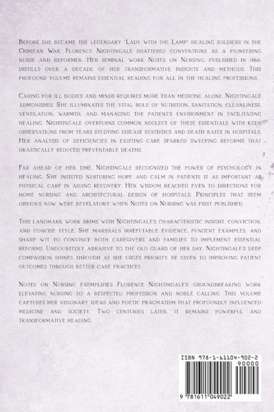 Before she became the legendary "Lady with the Lamp" healing soldiers in the Crimean War, Florence Nightingale shattered conventions as a pioneering nurse and reformer. Her seminal work Notes on Nursing, published in 1860, distills over a decade of her transformative insights and methods. This profound volume remains essential reading for all in the healing professions. Caring for ill bodies and minds requires more than medicine alone, Nightingale admonishes. She illuminates the vital role of nutrition, sanitation, cleanliness, ventilation, warmth, and managing the patient's environment in facilitating healing. Nightingale overturns common neglect of these essentials with keen observations from years studying disease statistics and death rates in hospitals. Her analysis of deficiencies in existing care sparked sweeping reforms that drastically reduced preventable deaths. Far ahead of her time, Nightingale recognized the power of psychology in healing. She insisted nurturing hope and calm in patients is as important as physical care in aiding recovery. Her wisdom reached even to directions for home nursing and architectural design of hospitals. Principles that seem obvious now were revelatory when Notes on Nursing was first published. This landmark work brims with Nightingale's characteristic insight, conviction, and concise style. She marshals irrefutable evidence, pungent examples, and sharp wit to convince both caregivers and families to implement essential reforms. Undoubtedly abrasive to the old guard of her day, Nightingale's deep compassion shines through as she urges priority be given to improving patient outcomes through better care practices. Notes on Nursing exemplifies Florence Nightingale's groundbreaking work elevating nursing to a respected profession and noble calling. This volume captures her visionary ideas and poetic pragmatism that profoundly influenced medicine and society. Two centuries later, it remains powerful and transformative reading.