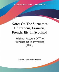 ""Notes On The Surnames Of Francus, Franceis, French, Etc. In Scotland: With An Account Of The Frenches Of Thornydykes"" is a historical book written by Aaron Davis Weld French and published in 1893. The book provides a comprehensive account of the French surname and its variations in Scotland, exploring its origins, meanings, and distribution across the country. The author also delves into the history of the Frenches of Thornydykes, a prominent family in Scotland, tracing their lineage and contributions to Scottish society. This book is a valuable resource for genealogists, historians, and anyone interested in Scottish history and culture.This scarce antiquarian book is a facsimile reprint of the old original and may contain some imperfections such as library marks and notations. Because we believe this work is culturally important, we have made it available as part of our commitment for protecting, preserving, and promoting the world's literature in affordable, high quality, modern editions, that are true to their original work.