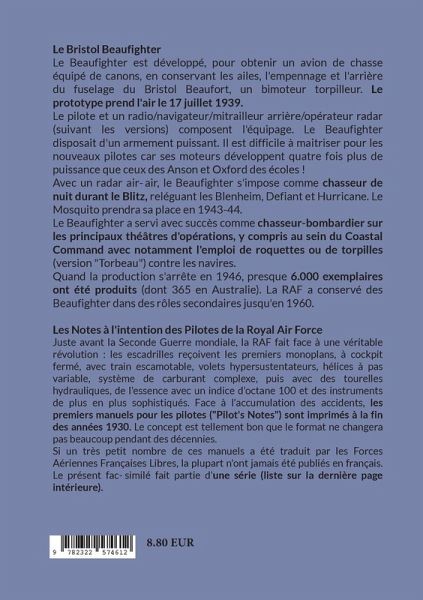 Le Bristol Beaufighter est développé, pour obtenir un avion de chasse équipé de canons, en conservant les ailes, l'empennage et l'arrière du fuselage du Beaufort. Le prototype prend l'air le 17 juillet 1939. Le pilote et un radio/navigateur/mitrailleur arrière/opérateur radar (suivant les versions) composent l'équipage. Le Beaufighter disposait d'un armement puissant. Il est difficile à maitriser pour les nouveaux pilotes car ses moteurs développent quatre fois plus de puissance que ceux des Anson et Oxford des écoles ! Avec un radar air-air, le Beaufighter s'impose comme chasseur de nuit durant le Blitz, reléguant les Blenheim, Defiant et Hurricane. Le Mosquito prendra sa place en 1943-44. Le Beaufighter a servi avec succès comme chasseur-bombardier sur les principaux théâtres d'opérations, y compris au sein du Coastal Command avec notamment l'emploi de roquettes ou de torpilles (version "Torbeau") contre les navires. Lorsque la production s'arrête en 1946, presque 6.000 exemplaires ont été produits (dont 365 en Australie). La RAF a conservé des Beaufighter dans des rôles secondaires jusqu'en 1960. Les Notes à l'intention des Pilotes de la Royal Air Force Juste avant la Seconde Guerre mondiale, la RAF fait face à une véritable révolution : les escadrilles reçoivent les premiers monoplans, à cockpit fermé, avec train escamotable, volets hypersustentateurs, hélices à pas variable, système de carburant complexe, puis avec des tourelles hydrauliques, de l'essence avec un indice d'octane 100 et des instruments de plus en plus sophistiqués. Face à l'accumulation des accidents, les premiers manuels pour les pilotes ("Pilot's Notes") sont imprimés à la fin des années 1930. Le concept est tellement bon que le format ne changera pas beaucoup pendant des décennies. Si un très petit nombre de ces manuels a été traduit par les Forces Aériennes Françaises Libres, la plupart n'ont jamais été publiés en français. Le présent fac-similé fait partie d'une série.