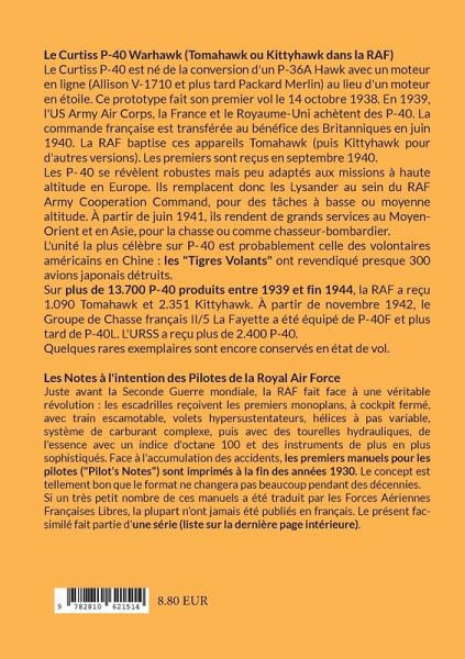 Le Curtiss P-40 Warhawk (Tomahawk ou Kittyhawk dans la RAF) Le Curtiss P-40 est né de la conversion d'un P-36A Hawk avec un moteur en ligne (Allison V-1710 et plus tard Packard Merlin) au lieu d'un moteur en étoile. Ce prototype fait son premier vol le 14 octobre 1938. En 1939, l'US Army Air Corps, la France et le Royaume-Uni commandent leurs premiers P-40. La commande française n°F-273 est transférée au bénéfice des Britanniques en juin 1940. La RAF baptise ces appareils Tomahawk (puis Kittyhawk pour d'autres versions). Les premiers sont livrés en septembre 1940. Les P-40 se révèlent robustes mais peu adaptés aux missions à haute altitude des chasseurs en Europe. Ils remplacent donc les Lysander au sein du RAF Army Cooperation Command, pour des tâches à basse altitude. À partir de juin 1941, ils rendent de grands services au Moyen-Orient, et plus tard en Asie, que ce soit pour la chasse ou comme chasseur-bombardier. L'unité la plus célèbre sur P-40 est probablement celle des volontaires américains en Chine : les "Tigres Volants" ont revendiqué presque 300 avions japonais détruits. Sur plus de 13.700 P-40 produits entre 1939 et fin 1944, la RAF a reçu 1.090 Tomahawk et 2.351 Kittyhawk. À partir de novembre 1942, le Groupe de Chasse français II/5 La Fayette a été équipé de P-40F et plus tard de P-40L. L'URSS a reçu plus de 2.400 P-40. Quelques rares exemplaires sont encore conservés en état de vol. Les Notes à l'intention des Pilotes de la Royal Air Force Juste avant la Seconde Guerre mondiale, la RAF fait face à une véritable révolution : les escadrilles reçoivent les premiers monoplans, à cockpit fermé, avec train escamotable, volets hypersustentateurs, hélices à pas variable, système de carburant complexe, puis avec des tourelles hydrauliques, de l'essence avec un indice d'octane 100 et des instruments de plus en plus sophistiqués. Face à l'accumulation des accidents, les premiers manuels pour les pilotes ("Pilot's Notes") sont imprimés à la fin des années 1930. Le concept est tellement bon que le format ne changera pas beaucoup pendant des décennies. Si un très petit nombre de ces manuels a été traduit par les Forces Aériennes Françaises Libres, la plupart n'ont jamais été publiés en français. Le présent fac-similé fait partie d'une série.