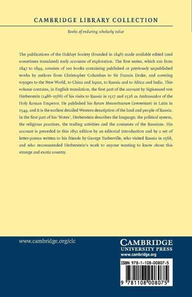 The publications of the Hakluyt Society (founded in 1846) made available edited (and sometimes translated) early accounts of exploration. The first series, which ran from 1847 to 1899, consists of 100 books containing published or previously unpublished works by authors from Christopher Columbus to Sir Francis Drake, and covering voyages to the New World, to China and Japan, to Russia and to Africa and India. This volume contains the first part of the account by Sigismund von Herberstein (1486-1566) of his visits to Russia in 1517 and 1526 as Ambassador of the Holy Roman Emperor. He published his Rerum Moscoviticarum Commentarii in Latin in 1549, and it is the earliest detailed Western description of the land and people of Russia. It is preceded in this 1851 translation by a set of letter-poems written to his friends by George Turberville, who visited Russia in 1568.