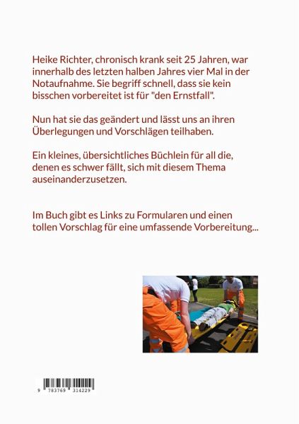 Heike Richter, chronisch krank seit 25 Jahren, war innerhalb des letzten halben Jahres vier Mal in der Notaufnahme. Sie begriff schnell, dass sie kein bisschen vorbereitet ist für "den Ernstfall". Nun hat sie das geändert und lässt uns an ihren Überlegungen und Vorschlägen teilhaben. Ein kleines, übersichtliches Büchlein für all die, denen es schwer fällt, sich mit diesem Thema auseinanderzusetzen. Im Buch gibt es Links zu Formularen und einen tollen Vorschlag für eine umfassende Vorbereitung...